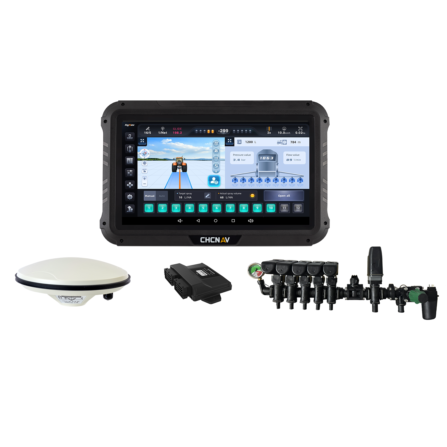 CHCNAV SPRAY X100 je navrhnutý pre jednoduchú montáž na rôzne typy postrekovačov. Ovládanie prebieha cez 10,1" dotykový displej navigácie, ktorý poskytuje prehľadné informácie o práci.